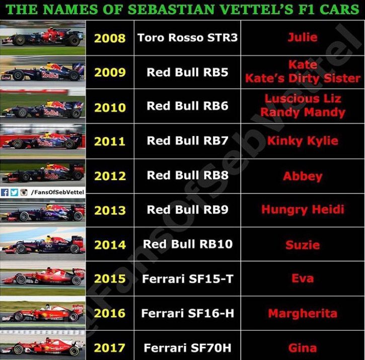 Ο Vettel αρνήθηκε να αποκαλύψει από που εμπνεύστηκε το όνομα, θέλοντας να κρατήσει το ενδιαφέρον αμείωτο. Θυμίζουμε ότι από το 2008, ο τετράκις παγκόσμιος πρωταθλητής βαπτίζει όλα τα μονοθέσια του. Πέρυσι, είχε ονομάσει «Μαργαρίτα» τη Ferrari SF16-H, πριν δύο χρόνια φώναζε «Εύα» τη SF15-T, ενώ όσο ήταν στη Red Bull Racing προτιμούσε τα πιο τολμηρά, όπως «βιτσιόζα Kylie» και «χυμώδης Liz».