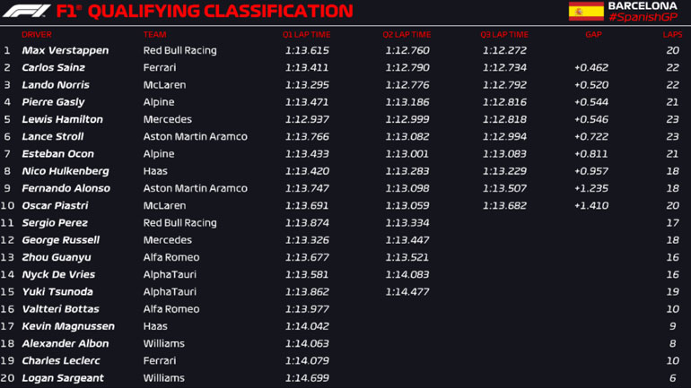 Ο οδηγός της Red Bull, Max Verstappen, πήρε την pole position στο Ισπανικό Grand Prix, κερδίζοντας άνετα τον αντίπαλο του Ferrari Carlos Sainz και τον Lando Norris της McLaren στην προκριματική περίοδο του Σαββάτου στο Circuit de Barcelona-Catalunya.
