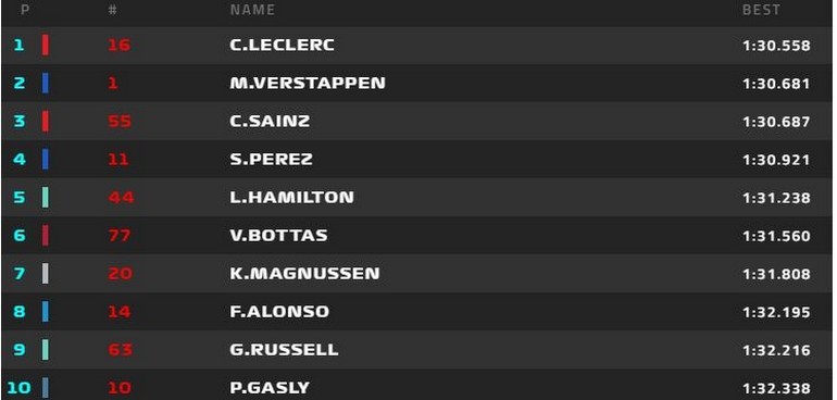 Στα χθεσινά δοκιμαστικά ο Μονεγάσκος ήταν άπιαστος. Για 0.123 του δευτερολέπτου κέρδισε από τον Max Verstappen την Pole Position. Οι διαφορές στους τέσσερις πρώτους είναι μικρότερες του δευτερολέπτου. Αν συγκρίνετε τους χρόνους θα καταλάβετε το τι έχει να γίνει σήμερα στον αγώνα. Ο Charles Leclerc έκανε 1.30.558 , o Verstappen 1.30.681, ο Sainz 1.30.687 και ο Perez 1.30.921. Η διαφορά του πρώτου ( Leclerc) με τον δεύτερο (Verstappen ) είναι +0.123 ενώ μόλις 6 χιλιοστά πίσω του είναι ο Sainz που συμπλήρωσε την πρώτη τριάδα.