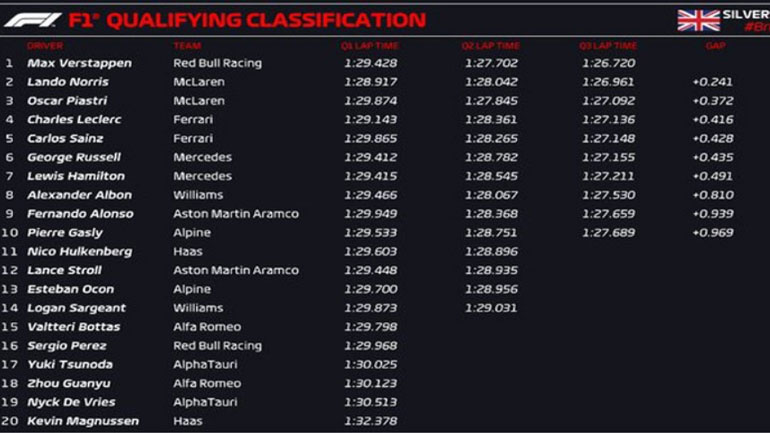 Ο Ολλανδός ξεπέρασε τις μεταβαλλόμενες συνθήκες και ένα στιγμιαίο περιστατικό στα πιτ, που προκάλεσε ζημιά στην εμπρόσθια αεροτομή και κατάφερε να κατακτήσει την pole position, δύο δέκατα ταχύτερος από τον Norris και ακόμα ένα δέκατο ταχύτερος από τον Piastri.