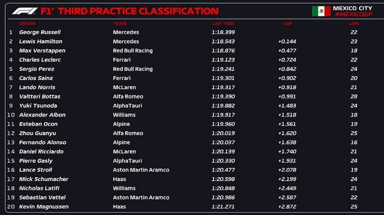 Σε λίγη ώρα ξεκινάνε τα επίσημα χρονομετρημένα δοκιμαστικά από όπου θα κριθεί και ο Pole Man του αυριανού Grand Prix. Στα τρίτα ελεύθερα δοκιμαστικά ο George Russell έκλεισε πονηρά το μάτι στον Team mate του και με διαφορά 0.144 του δευτερολέπτου κέρδισε την πρώτη θέση. Μπορεί στον Lewis Hamilton να μην άρεσε και τόσο αυτό ωστόσο ο Toto Wolff έδειχνε απόλυτα ικανοποιημένος αφού τα δυο του μονοθέσια έκαναν το 1-2.Τρίτος ήταν ο Verstappen και τέταρτος ο Leclerc. Την πεντάδα έκλεισε ο Μεξικανός P.Perez.