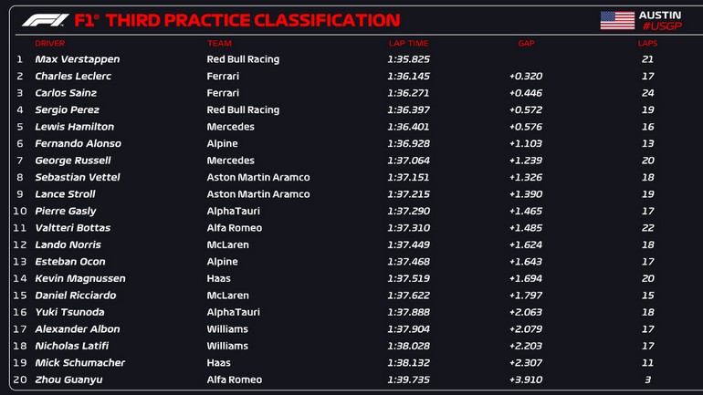 To Circuit of The Americas, στο Austin είναι ήδη γεμάτο από κόσμο που παρακολούθησε τις προσπάθειες των οδηγών στο Practice 3. Εκεί ο Max Verstappen τα έδωσε και όλα και μετά από σκληρή κόντρα κέρδισε τον αντίπαλο του Charles Leclerc. Πίσω από τον Μονεγάσκο τερμάτισε ο Ισπανός ομόσταυλος του Carlos Sainz.