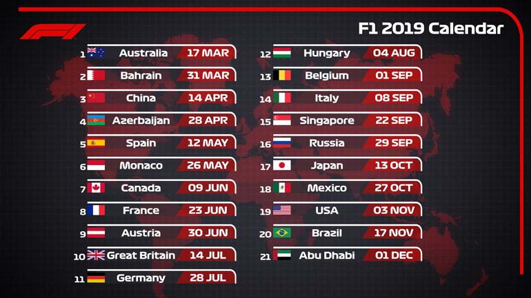 Το καλεντάρι αποτελείται από 21 Grand Prix, με την αυλαία να ανοίγει παραδοσιακά στην Αυστραλία τον Μάρτιο και την καρό σημαία να πέφτει στο Άμπου Ντάμπι τον Δεκέμβριο, κάτι το οποίο έχει να συμβεί από το 1963.
