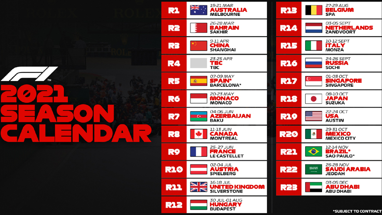 Η σεζόν 2021 θα ξεκινήσει στις 21 Μαρτίου από τη Μελβούρνη της Αυστραλίας και θα ολοκληρωθεί στο Άμπου Ντάμπι στις 5 Δεκεμβρίου. Στη λίστα που έδωσε στη δημοσιότητα η FIA περιλαμβάνονται 23 αγώνες, με αυτόν στις 25 Απριλίου να μένει κενός.