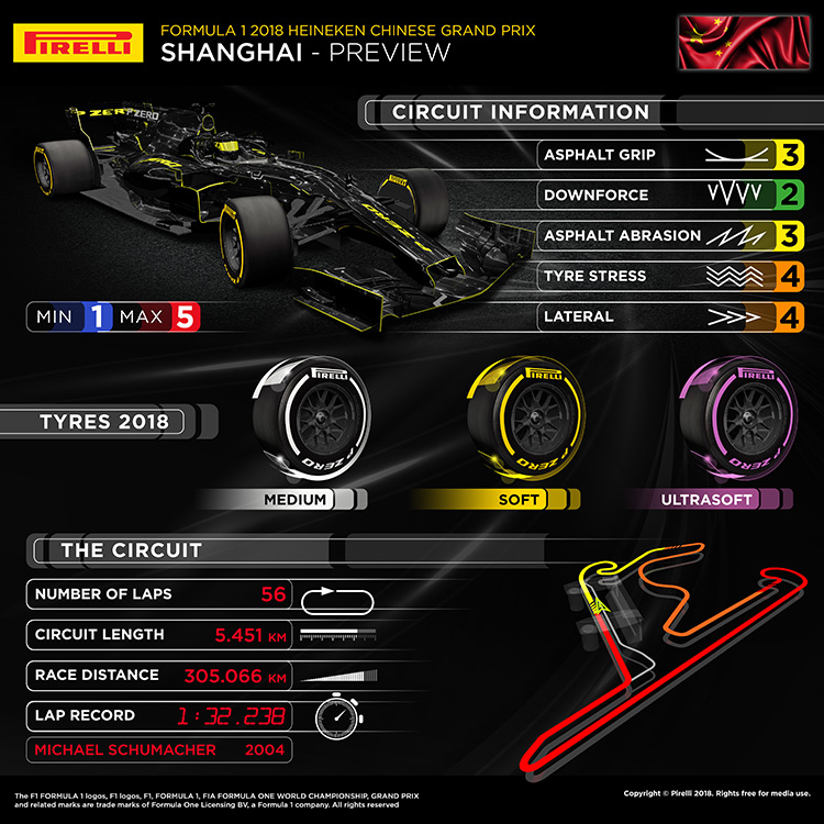 Το Shanghai International Circuit είναι ιδιαίτερα απαιτητικό, αλλά ευνοεί τα προσπεράσματα, γεγονός που που θα αυξήσει το θέαμα. Raikkonen και Bottas θα παίξουν το δικό τους σημαντικό ρόλο στην εξέλιξη του αγώνα, ενώ στις πίσω σειρές του grid δεν μπορεί να γίνει καμία πρόβλεψη.