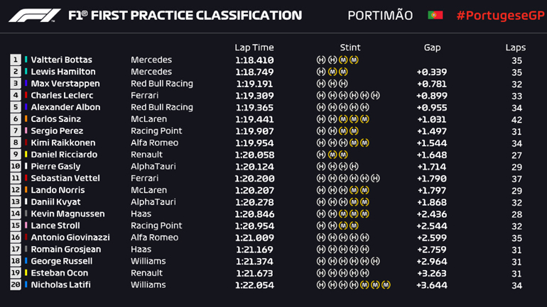 Valtteri Bottas και Lewis Hamilton ήταν οι μοναδικοί που κατέβηκαν κάτω από το 1:19.00 στην πορτογαλική πίστα, αλλά και οι μόνοι από τους πέντε πρώτους που χρησιμοποίησαν μεσαία ελαστικά. Οι Max Verstappen, Charles Leclerc και Alex Albon δοκίμασαν μόνο τη σκληρή γόμα, όπως και η πλειοψηφία των οδηγών.