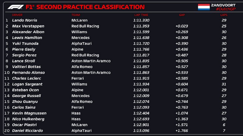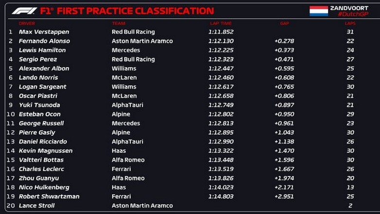 Ας επιστρέψουμε όμως στις ελεύθερες δοκιμές. Στην κατάμεστη πίστα από Ολλανδούς φίλους της F1 που είχαν κατακλύσει όλες τις αριθμημένες θέσεις για να χειροκροτήσουν τον παγκόσμιο πρωταθλητή συμπατριώτη τους, ο Max Verstappen, τους αποζημίωσε. Στο Practice 1, ο πρωταθλητής της F1 «γύρισε» την πίστα σε 1:11.852 και πήρε την πρώτη θέση. Με διαφορά 278 χιλιοστά πίσω του βρέθηκε ο Fernando Alonso ενώ στην τρίτη θέση βρέθηκε ο Βρετανός Lewis Hamilton.