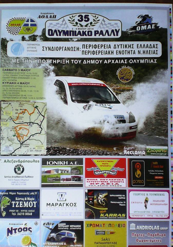 Με την διεξαγωγή του 35ου Ολυμπιακού Ράλι συνεχίζεται το Σαββατοκύριακο 3-4 Μαΐου το πανελλήνιο πρωτάθλημα ράλι. Η πανηγυρική εκκίνηση, που κάθε χρόνο συγκεντρώνει πλήθος κόσμου, είναι προγραμματισμένη για σήμερα στις 21.00 στην κεντρική πλατεία της Αρχαίας Ολυμπίας.