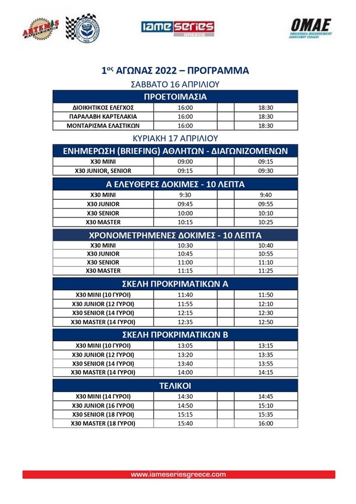 Αύριο, Κυριακή 17 Απριλίου, τριάντα ταλαντούχοι οδηγοί κάθε ηλικίας δίνουν το παρόν τους στην πρεμιέρα των «warriors» του IAME Series Greece για το 2022. Το ραντεβού θα δοθεί στο φυσικό «σπίτι» του θεσμού, το Kartodromo. Καλό αυτό γιατί είναι κοντά στην Αθήνα και θα συγκεντρώσει αρκετό κόσμο. Βέβαια μπορεί ο καιρός να δυσκολέψει τις προσπάθειες των αγωνιζομένων. Το πιθανότερο είναι –εκτός από τα σύννεφα- να έχουμε βροχή οπότε αλλάζουν πολλά.