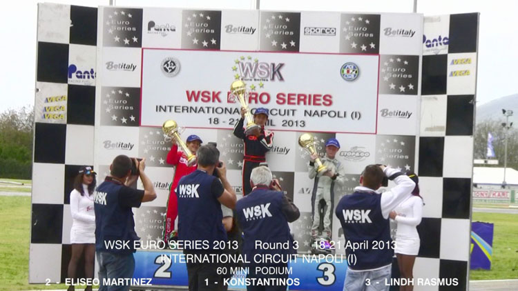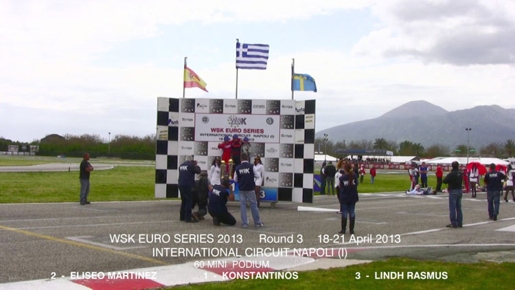 Στην πίστα International Circuit Napoli στο Sarno της Ιταλίας πραγματοποιήθηκε πριν από λίγες ημέρες, ο 3ος γύρος του WSK Euro Series 2013. Πρόκειται για έναν διεθνή αγώνα καρτ ο οποίος συγκέντρωσε το ενδιαφέρον 200 οδηγών από ολόκληρο τον κόσμο, μεταξύ αυτών και του Έλληνα πρωταθλητή στην κατηγορία Minι 60, «Κωνσταντίνου».