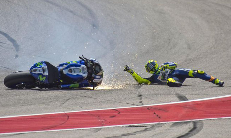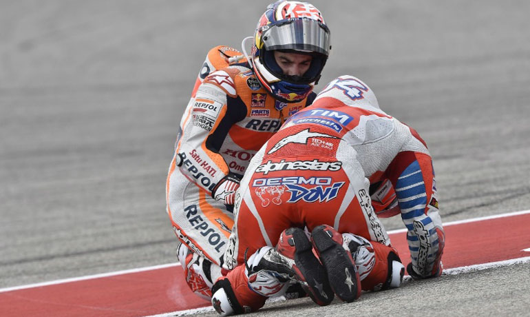 Το ίδιο συνέβη με τον Lorenzo, ο οποίος είδε τον Rossi να χάνει τον έλεγχο της Yamaha και να πέφτει στην αρχή του Grand Prix, όπως και τους Andrea Dovizioso – Dani Pedrosa λίγο αργότερα. Ο Dovi είναι αναμφισβήτητα ο πιο άτυχος τη φετινή σεζόν, αφού βλέπει για δεύτερη φορά έναν αναβάτη να πέφτει πάνω του, τη στιγμή που διεκδικεί με αξιώσεις μια θέση στο βάθρο και δείχνει σε πολύ καλή αγωνιστική κατάσταση.