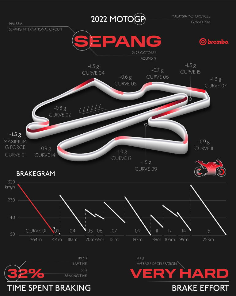 Tα MotoGP επιστρέφουν στη Μαλαισία, αφού έλειψαν τις δύο τελευταίες αγωνιστικές σεζόν, για τον προτελευταίο αγώνα του 2022. Η πίστα της Sepang, που έγιναν δοκιμές το 2020 και φέτος τον Φεβρουάριο, είναι μια από τις πιο απαιτητικές πίστες για τα φρένα, σύμφωνα με τους τεχνικούς της Brembo που συνεργάζονται με όλες τις ομάδες της κατηγορίας MotoGP.