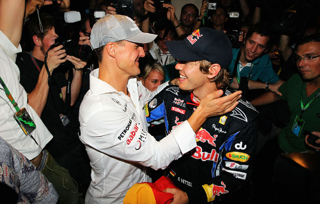 Για να τον τιμήσει, ο Vettel πήρε μέρος στις πρώτες χειμερινές δοκιμές στην πίστα της Jerez, με ένα κράνος που αποτελεί αντίγραφο του Schumi. Είναι σε λευκό χρώμα και έχει στο κέντρο μια λωρίδα με τη γερμανική σημαία, όπως αυτό που φορούσε ο συμπατριώτης του, στον τελικό του πρωταθλήματος καρτ, στο Le Mans, το 1985.
