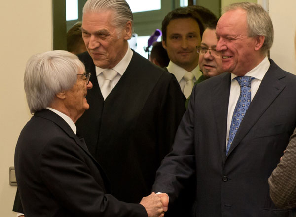Ο Ecclestone, κατηγορούνταν για τη δωροδοκία του Γερμανού τραπεζίτη Gerhard Gribkowsky, της Bayern Landesbank, στο πλαίσιο της πώλησης των τηλεοπτικών δικαιωμάτων της F1 το 2005-2006. O Βρετανός, παραδέχθηκε ότι έδωσε 44 εκατομμύρια δολάρια στον Gribkowsky, υποστηρίζοντας ότι έπεσε θύμα εκβιασμού. Ο τραπεζίτης έχει ήδη καταδικαστεί σε φυλάκιση 8,5 χρόνων για διαφθορά.