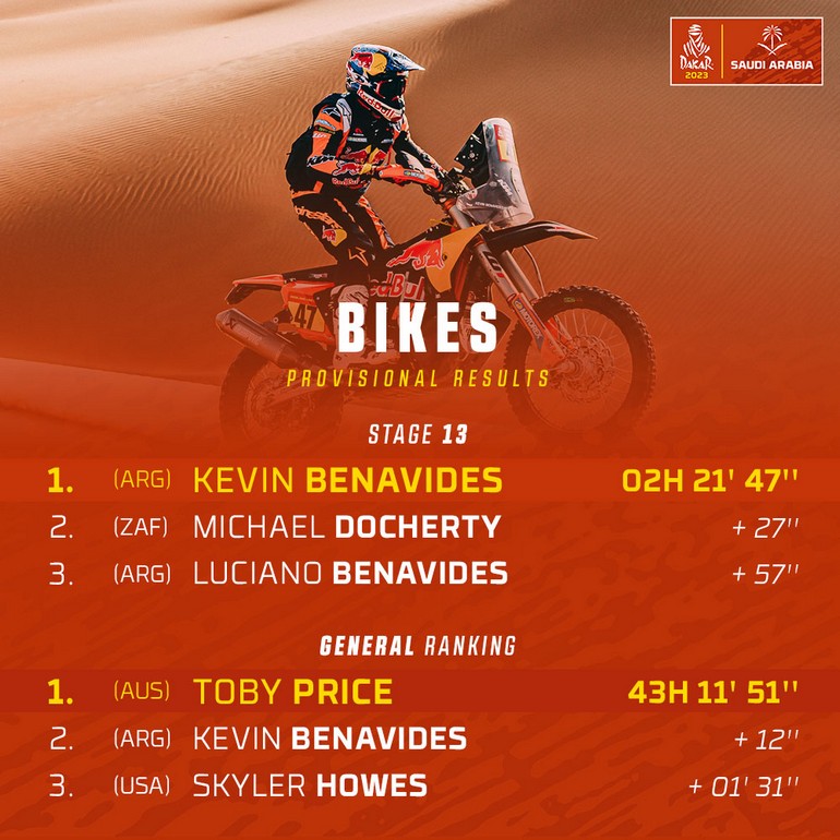 Η προτελευταία ειδική του Rally Dakar 2023 μας έχει στρώσει το χαλί για έναν τελικό που θα παρακολουθήσουμε με κομμένη την ανάσα. Μόλις 12” χωρίζουν αυτή τη στιγμή τους 2 πρώτους, μετά την σημερινή νίκη του Kevin Benavides. Ο Αργεντίνος αναβάτης σταμάτησε για να βοηθήσει τον ομόσταυλό του, Mathias Walker που είχε μια πτώση και μεταφέρθηκε με ελικόπτερο εκτός του Rally και μετά συνέχισε τον αγώνα από αρκετά πιο πίσω.