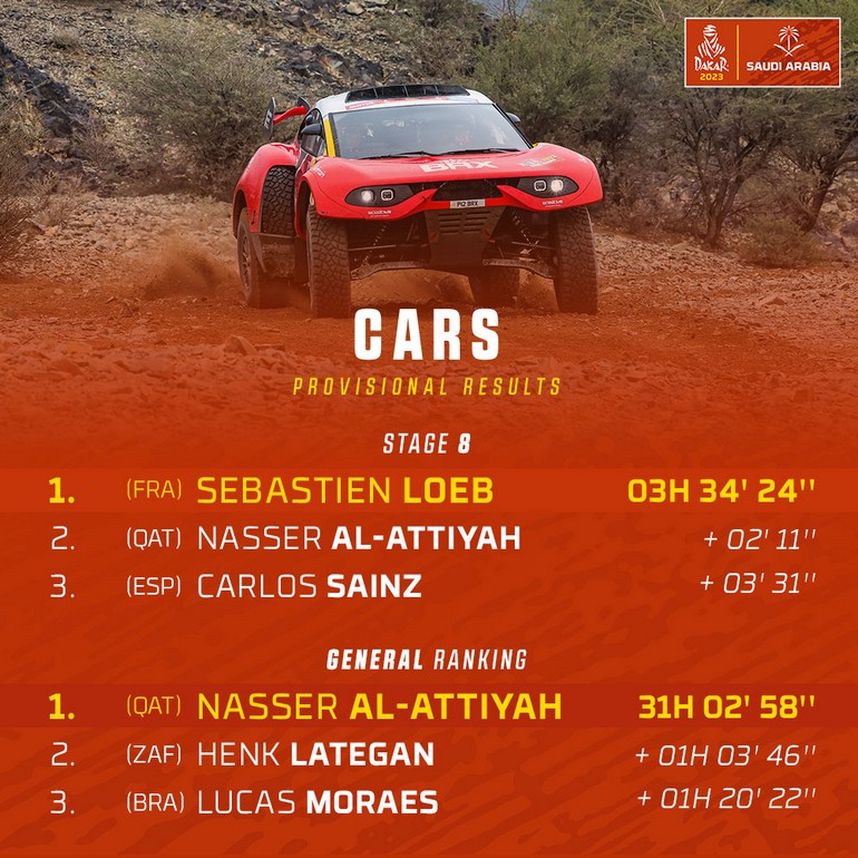 Τελικοί νικητές της ημέρας ήταν οι Sebastien Loeb-Fabian Lurquin (Hunter T1+). Ήταν η πρώτη τους νίκη στο φετινό Dakar ωστόσο οι επικεφαλής του αγώνα εξακολουθούν να είναι οι Nasser Al Attiyah-Matthieu Baumel (Toyota Hilux T1+) που έκαναν το δεύτερο καλύτερο χρόνο.