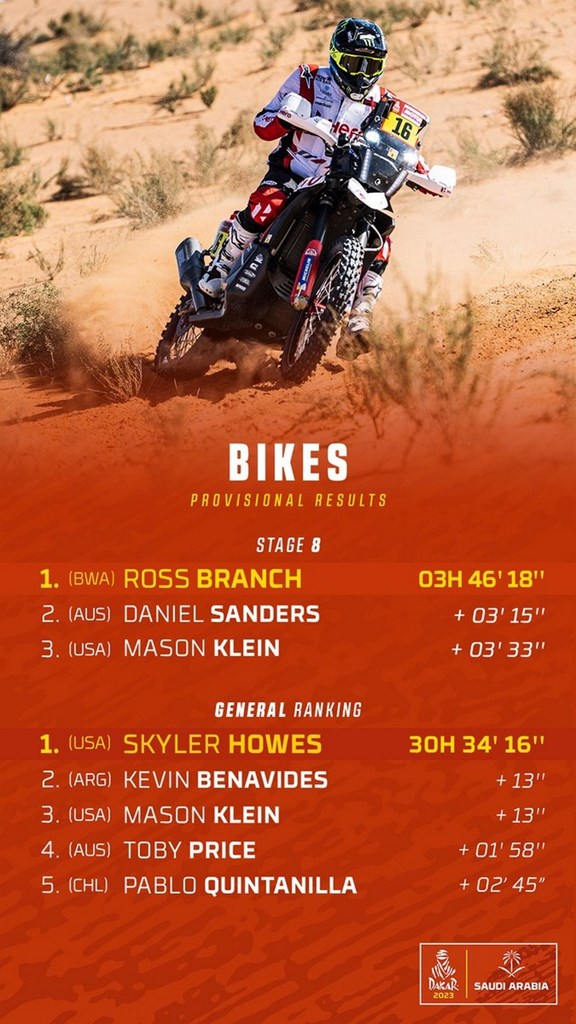 Μετά την χθεσινή ακύρωση της 7ης ειδικής, οι μοτοσυκλέτες συνέχισαν το Rally Dakar με την 8η ειδική, η οποία ήταν μια συντομευμένη εκδοχή της διαδρομής που είχε προγραμματιστεί για την προηγούμενη μέρα. Ο Ross Branch ξεκίνησε από την 17η θέση και, εκμεταλλευόμενος τα σημάδια των προηγούμενων αναβατών σε μια δύσκολη μέρα, κατάφερε να προηγηθεί στο σημείο ανεφοδιασμού και να πάρει την πρώτη του νίκη για το 2023.