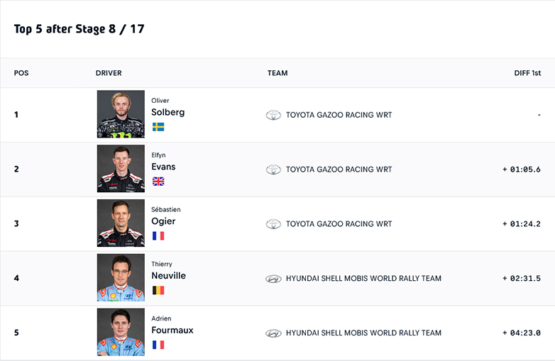 Όπως βλέπετε η διαφορά του Solberg με τον Evans είναι 1:04.2 ενώ του Solberg με τον Ogier είναι 1:39.9 . Στις τρείς πρώτες θέσεις είναι τρία δηλαδή Toyota Yaris Rally1.