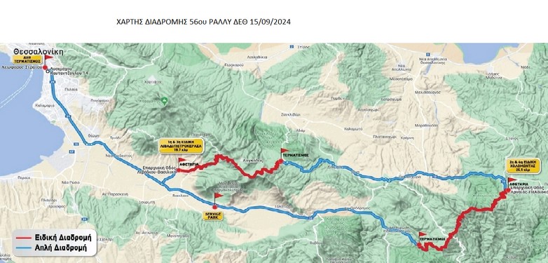 Όπως συμβαίνει στις τελευταίες διοργανώσεις, έτσι και φέτος το “56ο Ράλλυ Δ.Ε.Θ” περιλαμβάνει το προαιρετικό shakedown στη Γαλάτιστα, καθώς και τη πανηγυρική εκκίνηση και τον τερματισμό στη πλατεία Αριστοτέλους.