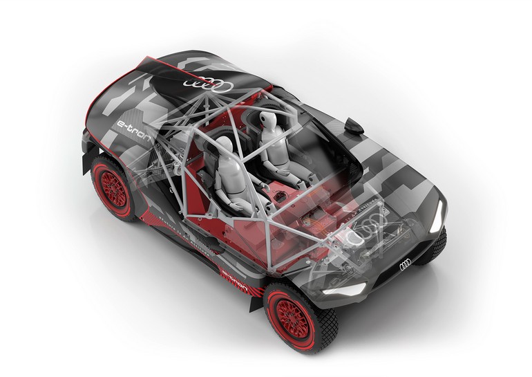 Η Audi Sport για το RS Q e-tron υιοθέτησε τα σχέδια σωληνωτού πλαισίου από το DTM (2004 έως 2011) καθώς και το πλαίσιο από φύλλα χάλυβα στο rallycross (2017 έως 2018) καθώς επίσης και τα μονοκόκ από ανθρακονήματα από τα σπορ αυτοκίνητα του LMP, του DTM και των μονθέσιων της Formula E. Για το ιδιαίτερα ανθεκτικό στις καταπονήσεις δάπεδο του RS Q e-tron, έχει υιοθετηθεί δομή σάντουιτς με χρήση χάλυβα, αλουμινίου και ειδικού αφρού, για την προστασία της μπαταρίας υψηλής τάσης και της δεξαμενής βενζίνης του μετατροπέα ενέργειας.