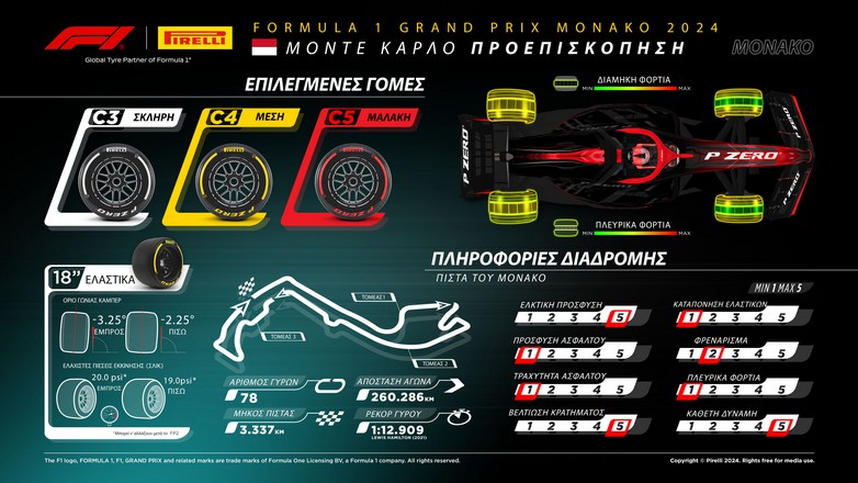 Η επιλογή της Pirelli για τα σλικ ελαστικά στο Μονακό είναι οι πιο μαλακές διαθέσιμες γόμες της γκάμας: Η C3 θα είναι η σκληρή γόμα, η C4 θα είναι η μεσαία γόμα και η C5 η μαλακή γόμα.