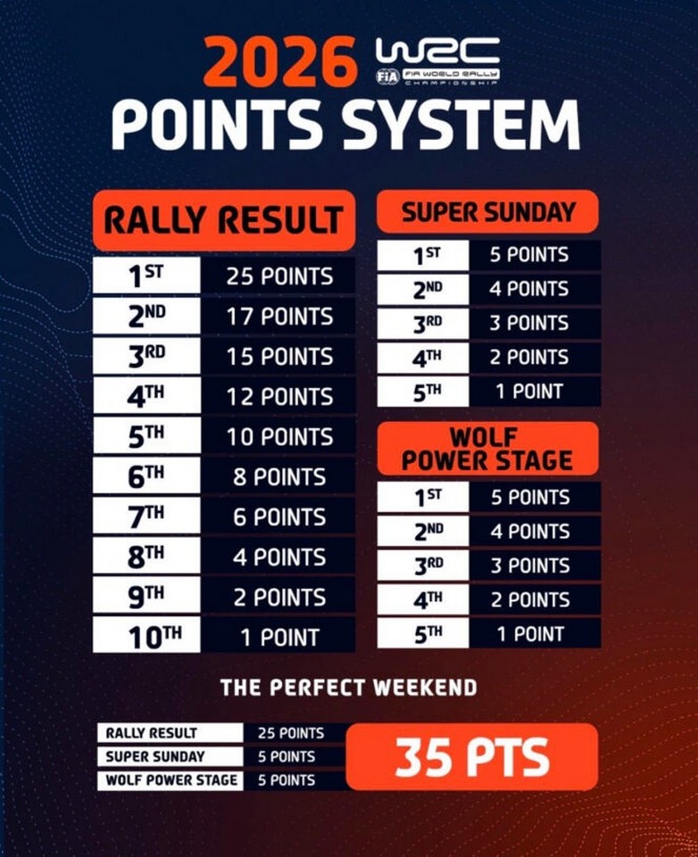 H μεγαλύτερη βαθμολογία που θα μπορεί να συγκεντρώσει ένα πλήρωμα θα είναι 35 βαθμούς. Αναλυτικά στον πίνακα οι τρεις βαθμολογίες σε κάθε αγώνα του WRC σύμφωνα με την κατάταξη.