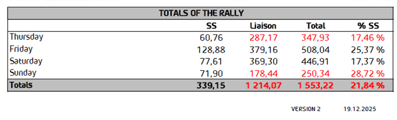 Φέτος τα συνολικά χιλιόμετρα που θα κάνουν είναι 1553.22. Από αυτά τα 1214.07 είναι απλές διαδρομές και τα 339.17 είναι ειδικές διαδρομές. Αύριο θα γίνουν τρεις ειδικές διαδρομές στις ‘Αλπεις. Το βράδυ της Πέμπτης, στην τελευταία ειδική διαδρομή δεν αποκλείεται σε κάποια σημεία ο δρόμος να είναι παγωμένος.