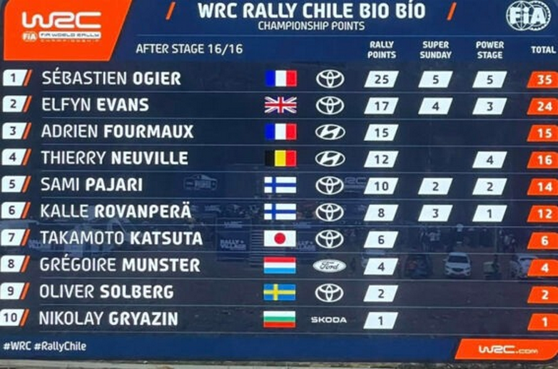 Στη Χιλή «μάζεψε» στο σύνολο 35 βαθμούς. Από τη νίκη στον αγώνα κέρδισε 25 βαθμούς, 5 από τις ειδικές διαδρομές της Κυριακής που ήταν ταχύτερος, στις 3 από τις 4 ειδικές και 5 βαθμούς από την power stage.
