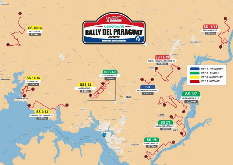 Το Rally del Paraguay έχει το κέντρο του αγώνα κοντά στα σύνορα με την Αργεντινή, στην πόλη Encarnaciοn. Οι διοργανωτές υπόσχονται να προσφέρουν έναν άριστα οργανωμένο αγώνα με ειδικές που έχουν μείγμα από ομαλές κόκκινες χωμάτινες διαδρομές αλλά και δύσκολες πουν είναι τεχνικές μέσα από πυκνή βλάστηση. Η επιφάνεια των δρόμων  είναι ως επί το πλείστων μαλακή και γρήγορη. Προσοχή χρειάζονται οι βαθιές αυλακώσεις και οι αλλαγές στην επιφάνεια.