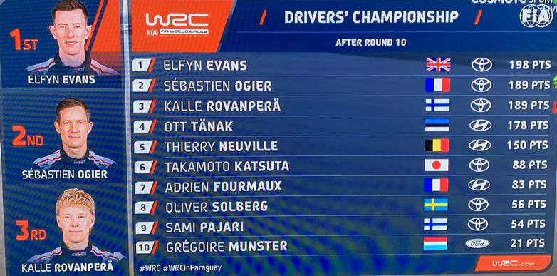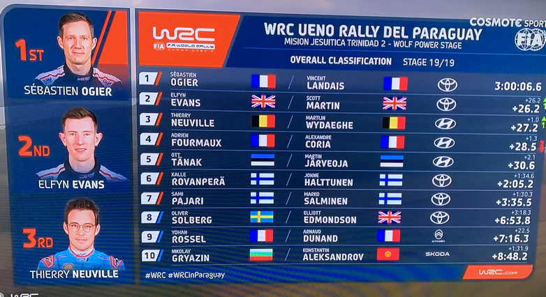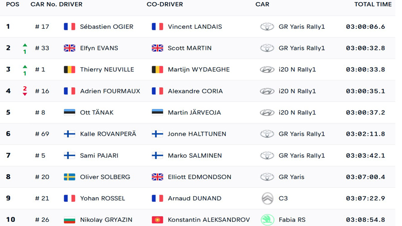Μετά από 19 Ε.Δ συνολικού μήκους 335.22 χλμ το γαλλικό δίδυμο Sebastien Ogier- Vincent Landais (Toyota GR Yaris Rally 1) ανέβηκε στο πρώτο σκαλί του βάθρου και κέρδισε πολύτιμους βαθμούς που του δίνουν τώρα την ελπίδα για έναν ακόμη παγκόσμιο τίτλο.