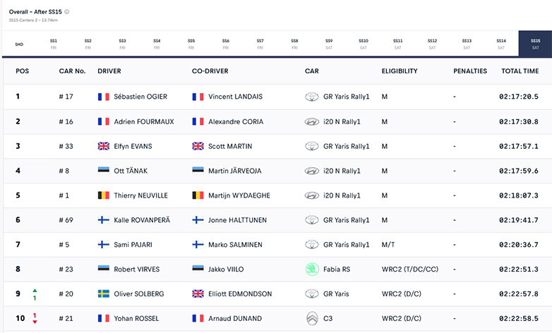 Οι Ogier- Landais πέρασαν στην πρώτη θέση και οι Γάλλοι Fourmoux- Coria στη 2η θέση. Ταυτόχρονα από ένα σκαλοπάτι ανέβηκαν οι Elfyn Evans- Scott Martin (Toyota GR Yaris Rally 1) , Ott Tanak- Martin Jarveoja Estonia (Hyundai i20 Rally1) και Thierry Neuville- Martijn Wydaeghe (Hyundai i20 Rally1)