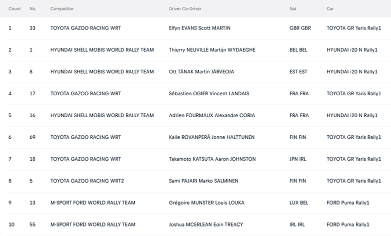 Στο χθεσινό shakedown ο Rovanpera με Toyota Yaris Rally1 ήταν πιο γρήγορος αλλά χωρίς να έχει κάποιο βαθμολογικό ενδιαφέρον. Έκανε μια διαδρομή 6.26 χλμ σε 4:10 ενώ το 2ο ταχύτερο χρόνο έκανε ο Katsuta. Στο WRC2 οι Gryazin-Aleksandrov με Skoda Fabia RS Rally2 ήταν οι ταχύτεροι με χρόνο 4:20.4.
