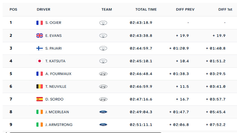 Ο 9 φορές παγκόσμιος πρωταθλητής Sébastien Ogier κέρδισε τον 5ο αγώνα της χρονιάς, αφού έκανε έναν εξαιρετικό αγώνα. «Μίλησε» η πείρα και το ταλέντο. Γιατί στην άλλη περίπτωση του Oliver Solberg «μίλησε» μόνο το ταλέντο. Ο Σουηδός, το πρωί της Παρασκευής είχε διαφορά από τον Γάλλο ομόσταυλό του 8.9’’.