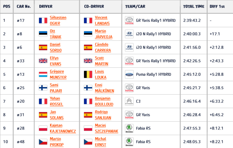 Έχοντας εκτός τους Neuville και Katsuta η σειρά άλλαξε και πάλι. Πίσω από τους Ogier και Ott tanak βρέθηκαν οι Dani Sordo – Candido Carrera και Elfyn Evans- Scott Martin.