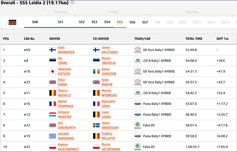 Οι Φινλανδοί κέρδισαν και τις έξι ειδικές και προηγούνται με 56.9’’ από τους ομόσταυλούς τους Elfyn Evans- Scott Martin. Στην τρίτη θέση με διαφορά +1.00.8 βρίσκεται το τρίτο εργοστασιακό Yaris με τους Takamoto Katsuta Japan – Aaron Johnston.