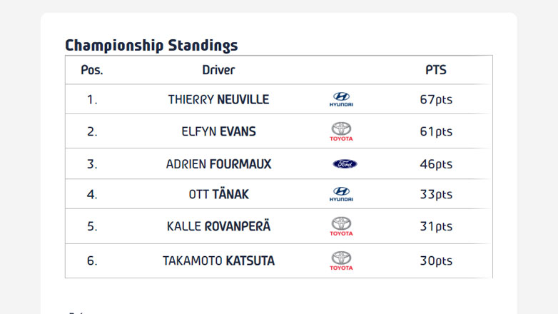 Η κατάταξη του φετινού πρωταθλήματος μετά το τέλος του Ράλλυ Αφρικής είναι: