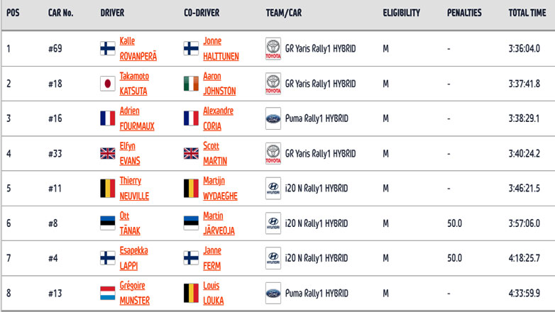 H Toyota έχει και έναν ακόμη λόγο να πανηγυρίζει, καθώς έκανε το 2 στα 2 μιας και πίσω από τον Rovnapera τερμάτισαν οι Takamoto Katsuta – Aaron Johnston με επίσης GR Yaris Rally1 HYBRID, ενώ στην τρίτη θέση του πόντιουμ ανέβηκαν οι Adrien Fourman – Alexandre Coria με Ford Puma Rally 1 Hybrid.