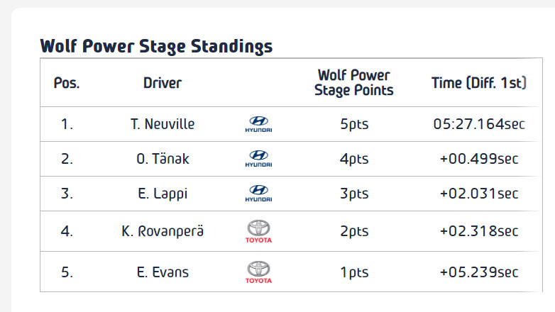 Οι οδηγοί της Hyundai, Neuville – Tanak – Lappi, που όλοι τους αντιμετώπισαν αρκετές προκλήσεις και προβλήματα στο φετινό Ράλλυ της Αφρικής, τα έδωσαν όλα στην Wolf Power Stage και πήραν αντίστοιχα τις θέσεις 1 – 2 – 3 . Παίρνοντας σημαντικούς βαθμούς αλλά και ψυχολογία μετά από ένα πολύ δύσκολοι ράλλυ που “έκρυβε” πολλές εκπλήξεις.