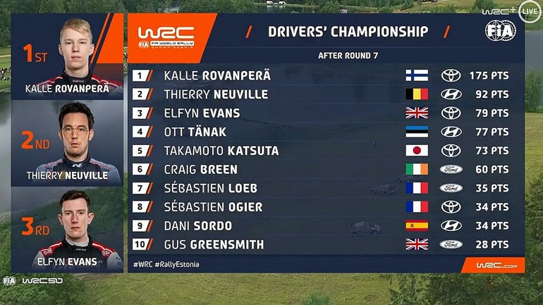 Μετά από επτά αγώνες ο Rovanpera έχει 175 βαθμούς, ο Neuville 92 και ο Evans 79 βαθμούς.