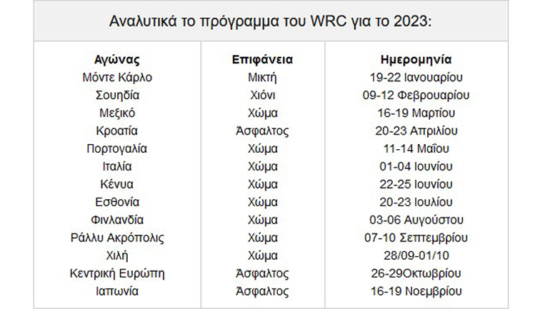 Αυτό που όλοι περιμέναμε τελικά ανακοινώθηκε -έστω και με μια μικρή καθυστέρηση- από την FIA. Το Rally Acropolis, θα είναι ο δέκατος αγώνας του Παγκοσμίου Πρωταθλήματος Ράλλυ και θα γίνει από τις 7-10 Σεπτεμβρίου. Η καθυστέρηση οφείλεται στις διαφωνίες που υπήρχαν αν θα έπρεπε να συμπεριληφθεί στο παγκόσμιο πρωτάθλημα η Σαουδική Αραβία. Μετά από αρκετές διαβουλεύσεις δεν τα βρήκαν η FIA με τον promoter και με τους εκπροσώπους από το κράτος του Κόλπου και έτσι η Σαουδική Αραβία για το 2023 έμεινε εκτός WRC.