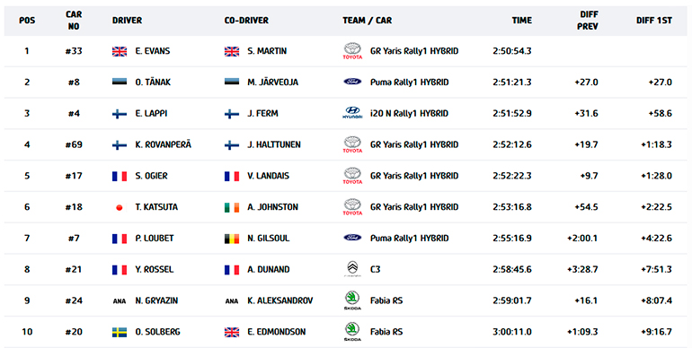Ο Tanak έκανε 7.06.1 και ο Evans 7.07.2. Ο αγώνας είχε πλέον κριθεί. Οι E.Evans – S. Martin κέρδισαν να ανέβασαν στο πρώτο σκαλί το GR Yaris Rally1 Hybrid.