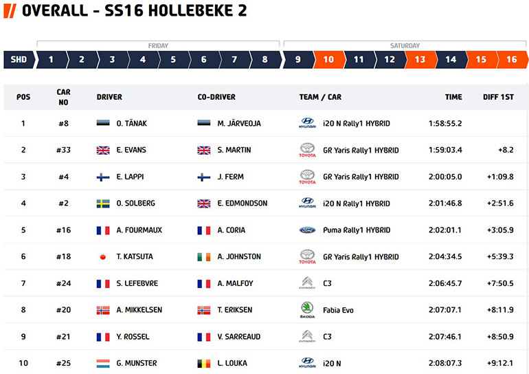 Η εγκατάλειψη του φαβορί του αγώνα άνοιξε το δρόμο στους Ott Tanak- Martin Jarveoja (Hyundai i20 Rally1) να τεθούν επικεφαλής στο Ypres Rally Belgium. Το δίδυμο της Hyundai έχει τώρα να δώσει μάχη με τους Elfyn Evans- Scott Martin (Toyota Yaris Rally1).