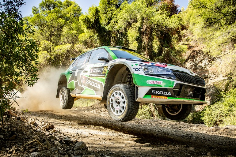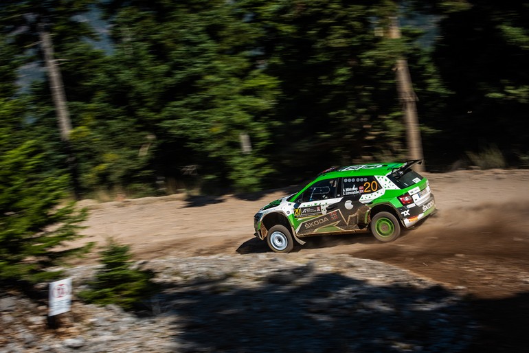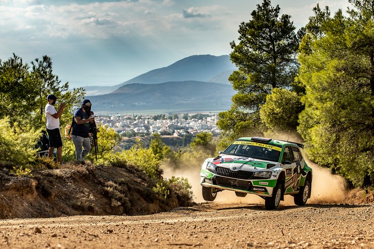 Η SKODA FABIA Rally2 evo, πολύ γρήγορη και αξιόπιστη, αποδείχτηκε το ιδανικό αγωνιστικό αυτοκίνητο για τα ξερά ή λασπωμένα, αφιλόξενα ή «πατημένα» ακροπολικά χώματα.