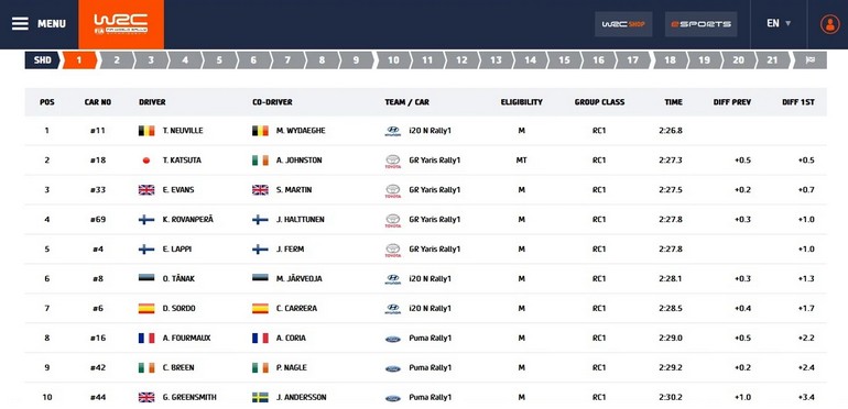 Όπως βλέπετε και στον παραπάνω πίνακα, ο Βέλγος με το Hyundai βρέθηκε μπροστά από τα τέσσερα Toyota. Από την αγωνιστική ομάδα της Toyota, καλύτερος ήταν ο Γιαπωνέζος Katsuta. Ακολούθησαν ο Elvin και ο Rovanpera.