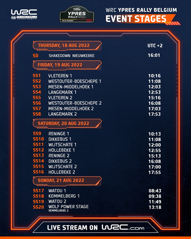 Ο αγώνας ξεκίνησε σήμερα το πρωί (19/8) και θα τελειώσει την Κυριακή (21/8) . Σήμερα θα γίνουν 8 ειδικές διαδρομές συνολικού μήκους 97 χλμ . Το Σάββατο (20/8) θα γίνουν άλλες οκτώ ειδικές συνολικού μήκους 133.22 χλμ. Η αυριανή ημέρα είναι η πιο δύσκολη. Την Κυριακή θα γίνουν τέσσερις ειδικές διαδρομές συνολικού μήκους 51.34 χλμ. Στις 20 ειδικές διαδρομές ,στο Ypres Rally Belgium τα πληρώματα θα καλύψουν συνολικά 281,58 χλμ.