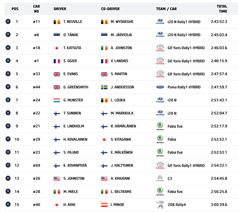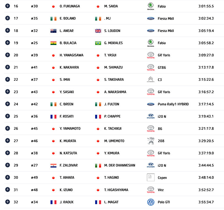 Παγκόσμιοι πρωταθλητές στο WRC για το 2022 είναι οι Φινλανδοί Kalle Rovanpera-Jonne Halttunen (GR Yaris Rally1 HYBRID) και στο WRC2 οι επίσης Φινλανδοί Emil Lindholm – R. Hanalainen ( Fabia Evo-WRC2TDJC).Στο τέλος της ειδικής όπου και τυπικά ο Lindholm και η Hanalainen αναδείχθηκαν παγκόσμιοι πρωταθλητές τους περίμεναν δυο γιαπωνέζες και τους προσέφεραν σαμπάνιες.