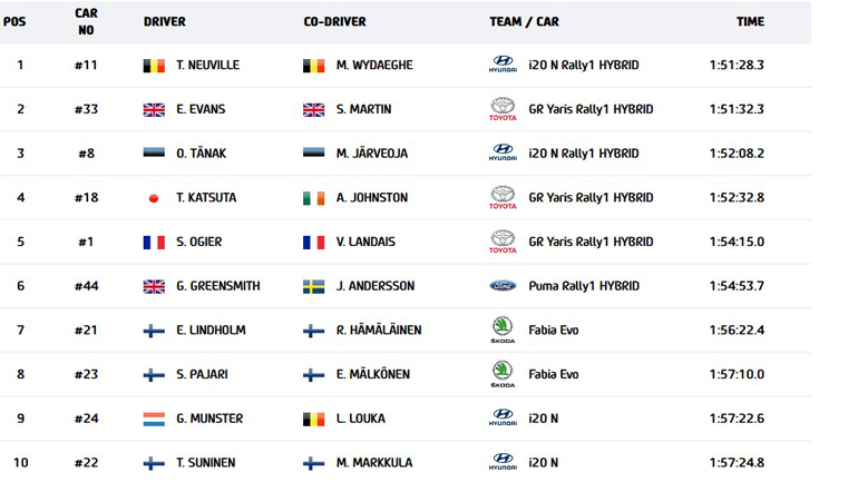 Αύριο η μεγάλη μάχη θα δοθεί ανάμεσα στους Neuville και Evans. Η διαφορά τους είναι μικρή και όλα παίζονται. Ο Ο.Tanak βρίσκεται 35.9 δευτερόλεπτα πίσω και δεν μπορεί να ελπίζει σε κάτι να αλλάξει στις πέντε ειδικές που απομένουν.