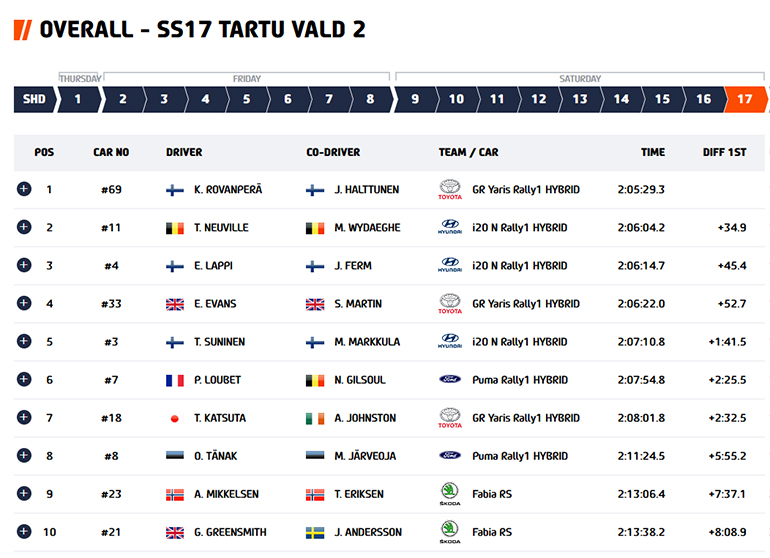 Οι Εσθονοί Ott Tanak- Martin Jarveoja (Ford Puma Rally Hybrid) βρίσκονται στην 8η θέση της γενικής κατάταξης. Εάν δεν είχαν τιμωρηθεί με τα πέντε λεπτά ποινής λόγω αλλαγής κινητήρα πριν από τον αγώνα, μπορούμε να πούμε ότι με τους χρόνους που κάνουν στις ειδικές διαδρομές, θα ήταν στη 2η θέση της γενικής κατάταξης.