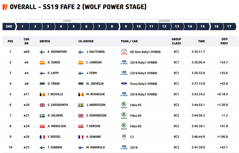 Να όμως που υπάρχουν και τα μηχανικά προβλήματα. Για άλλη μια φορά οι Neuville- Wydaeghe στάθηκαν άτυχοι. Στην πρώτη ειδική της ημέρας, στην 16η (τέσσερις ειδικές είχε η Κυριακή) η μονάδα ισχύος του i20 N.Rally 1 Hybrid «παρέδωσε» το πνεύμα και οι Βέλγοι σε κάθε ειδική έχαναν από μισό μέχρι ένα λεπτό. Η σειρά άλλαξε και από την 3η θέση πέρασαν στην 5η θέση της γενικής χάνοντας ταυτόχρονα και την τρίτη θέση στο βάθρο. Έτσι η σειρά μετά το δεύτερο Sordo άλλαξε πλέον ο Lappi βρέθηκε τρίτος και ο Tanak τέταρτος.