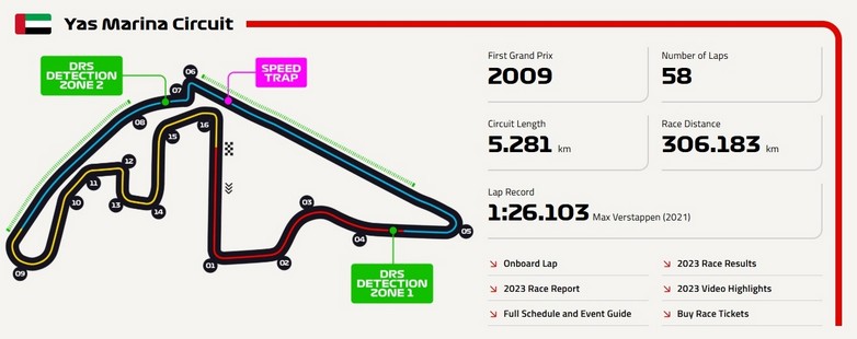 Η πίστα Yas Marina -πρώτος αγώνας έγινε το 2009- έχει συνολικό μήκος 5.281 μέτρα. Οι πιλότοι θα κάνουν την Κυριακή 58 γύρους και θα καλύψουν 306.183 χιλιόμετρα. Το ρεκόρ πίστας με 1.26.103 κατέχει από το 2021 ο Max Verstappen.